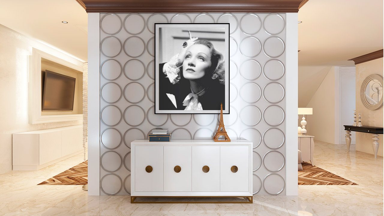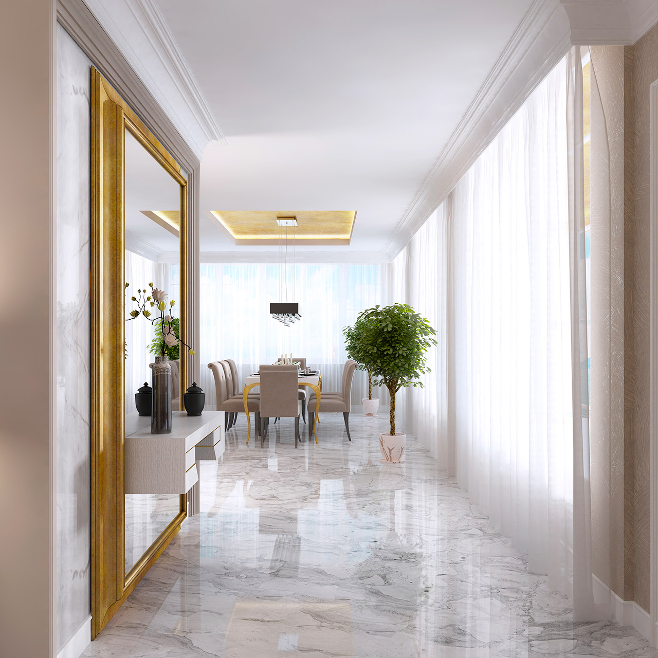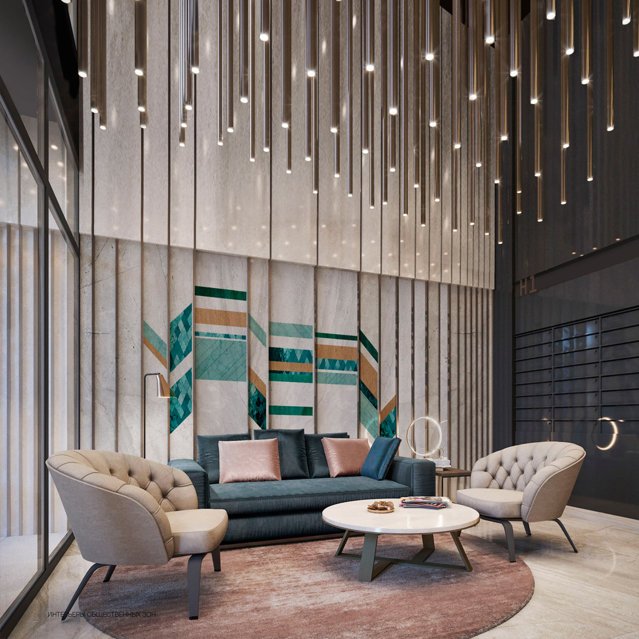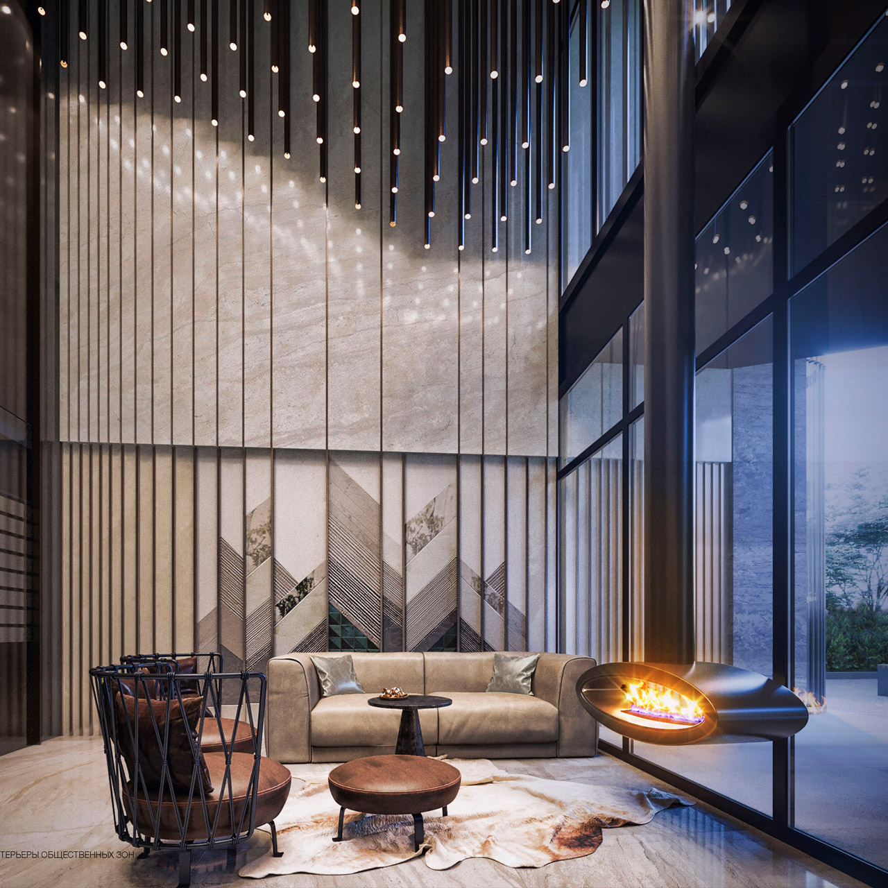 В «березовом» лобби — панно из серого и черного мрамора, передающее сдержанное благородство северной природы.