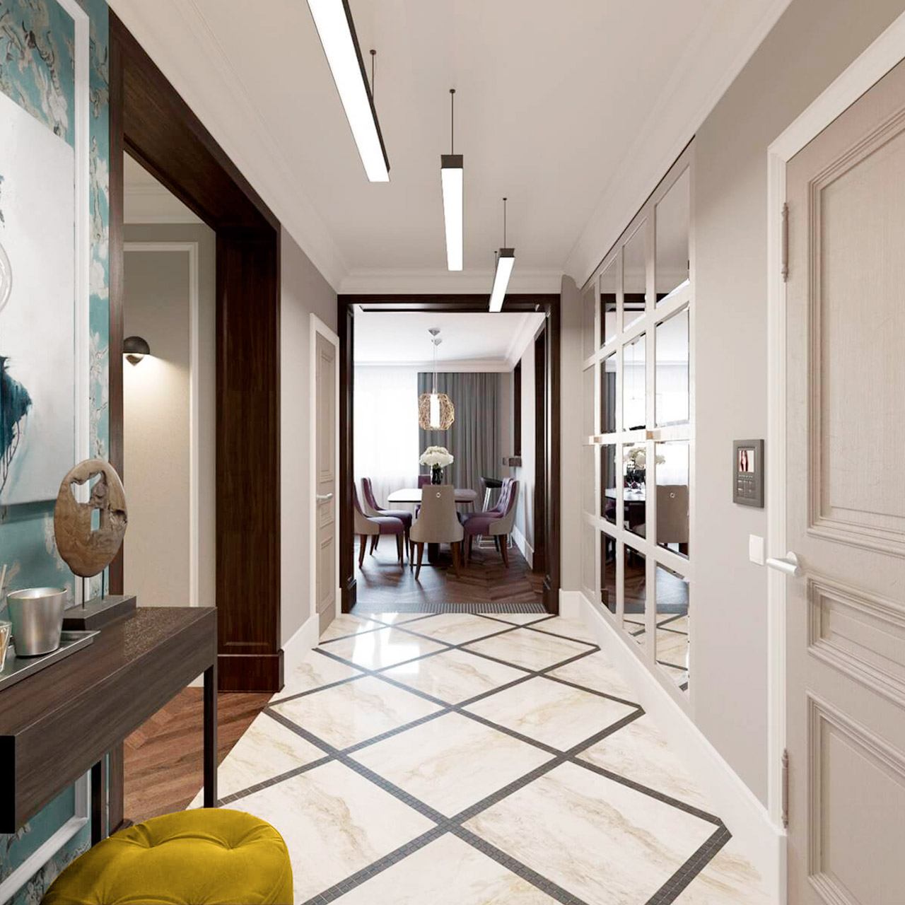 В «тайге» — геометричный орнамент, стилизованные верхушки елей. Уравновешенные светлым мрамором, эти паттерны создают настроение дома.